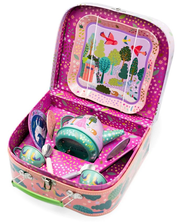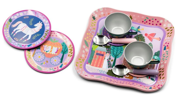 Zestaw do herbaty dla dzieci Bajkowy Świat ozdobiony jest ilustracjami księżniczek, smoków, bajkowych wież, karet z dyni i innych bajkowych elementów. W kolorowej walizeczce znajdziecie fantastyczny grający czajniczek z melodią „Teddy Bears' Picnic”, dwie filiżanki, dwa spodki, dwa talerzyki, tacę i inne akcesoria. Zestaw do herbaty dla dzieci pozwala na zabawę w dom i odgrywanie ról, stanowiąc również świetną propozycję zabawy dla grupy dzieci. Uczy umiejętności społecznych i nawiązywania relacji. Walizeczka wyposażona jest w poręczny uchwyt, dzięki czemu można ją łatwo przenosić z miejsca na miejsce.