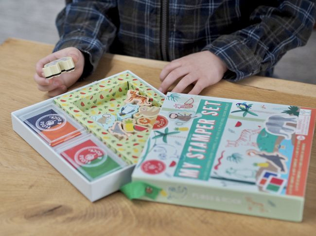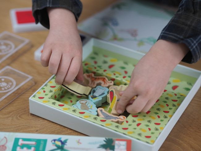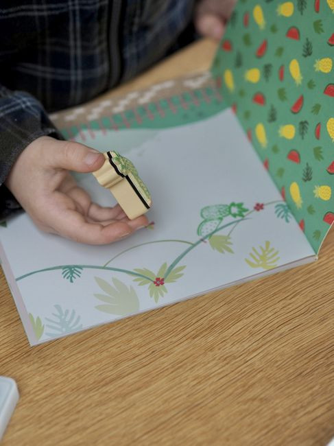 Otwórz 24-stronicową kolorową książeczkę i odkryj świat dzikich zwierząt i bujnej dżungli. Następnie daj się ponieść kreatywności, używając pieczątek przedstawiających lwa, małpę, pingwina, leniwca, fokę, tygrysa, słonia i inne motywy, aby ozdobić sceny i wymyślać zabawne historie.