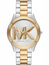 Zegarek Michael Kors MK4735 Slim Runway to bardzo efektowny i kobiecy dodatek zarówno do sportowych jak i casualowych stylizacji. Tarcza zegarka zdobiona cyrkoniami z dużym logo MK - całość zachowana w kolorze złota i srebra. Koperta i bransoleta wykonana ze stali szlachetnej również w złota i srebra. Zastosowane szkło mineralne, które gwarantuję ochronę przed pęknięciami. Zegarek posiada szczelność na poziomie 50 m co oznacza, że jest odporny na niewielkie zachlapanie.