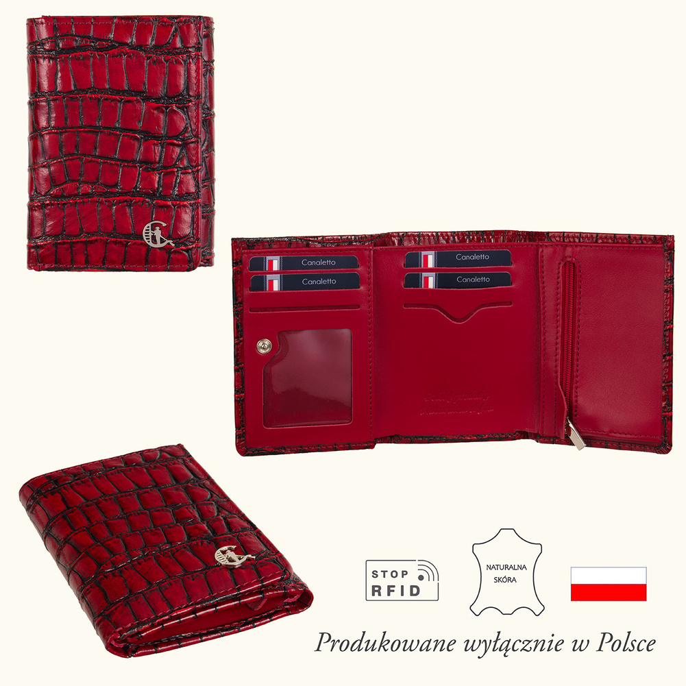 Ten niewielki portfel damski marki Canaletto to kwintesencja stylu i jakości. Wykonany z naturalnej skóry licowej tłoczonej na wzór krokodyla, łączy w sobie wyrafinowaną estetykę z codzienną funkcjonalnością. Lekki połysk dodaje mu elegancji, a kompaktowy rozmiar sprawia, że idealnie mieści się w mniejszych torebkach czy kieszeniach.