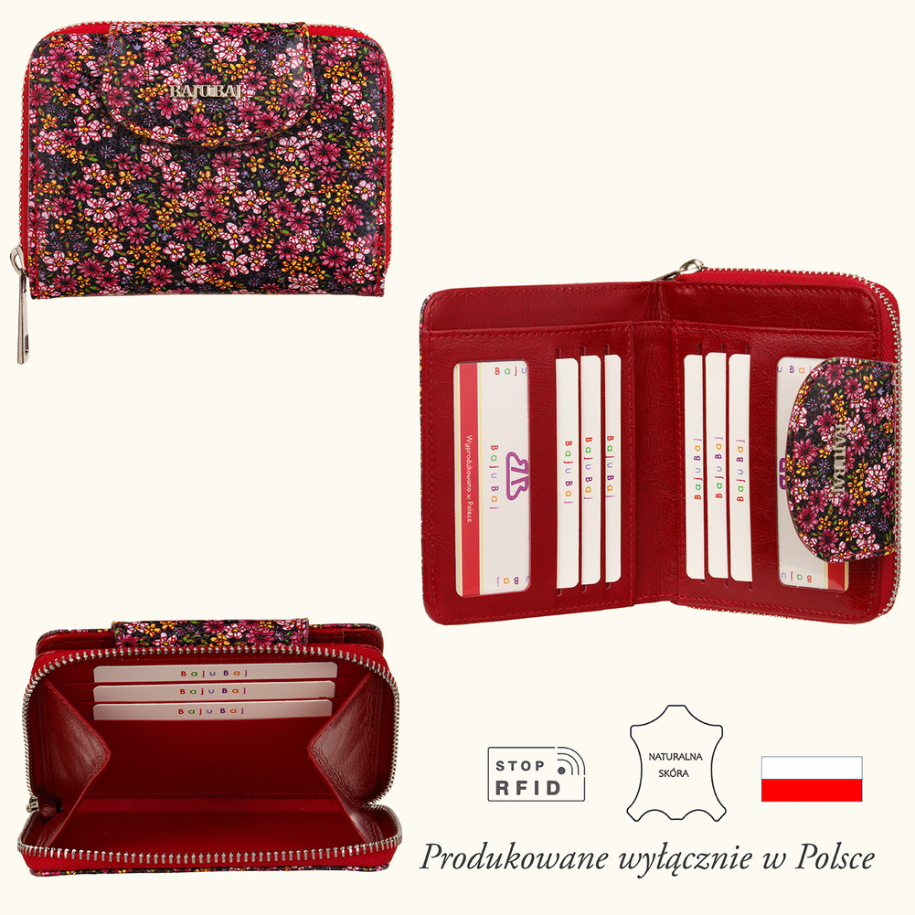 • Stylowy portfel damski Bajubaj z kolorowej skóry, ochrona RFID, 9 miejsc na karty. Elegancki, funkcjonalny i gotowy na prezent.