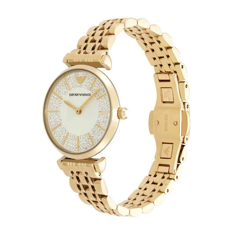 Damski zegarek Emporio Armani AR11608 z serii Gianni T-Bar to elegancki damski zegarek idealny na każdą okazję. Koperta oraz bransoleta zostały wykonane ze stali szlachetnej z powłoką PVD w złotym kolorze, co gwarantuje wieloletnią odporność na zniszczenie. Model posiada dokładny mechanizm kwarcowy zasilany baterią. Złota tarczę zdobioną srebrnymi cyrkoniami zabezpiecza odporne na zarysowania szkło mineralne.