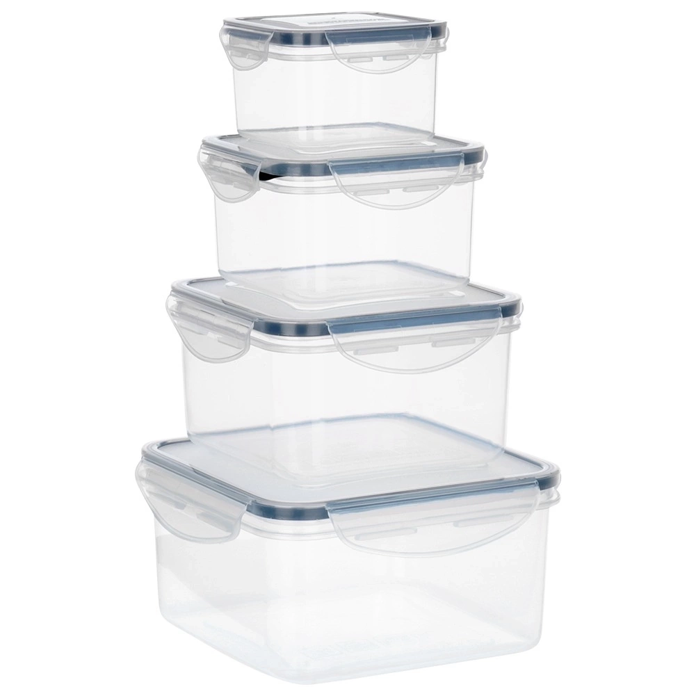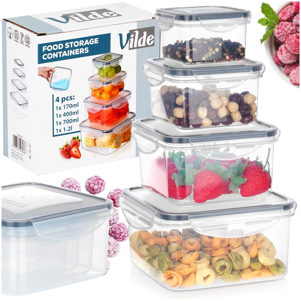 - Zestaw 4 pojemników na żywność - Zestaw 4 szt. pojemników kuchennych z pokrywkami do przechowywania żywności i produktów sypkich. W zestawie kwadratowe pojemniki w czterech różnych rozmiarach (1,2 l, 700 ml, 400 ml i 170 ml). Pojemniki można wygodnie przechowywać umieszczając je w największym pojemniku.
