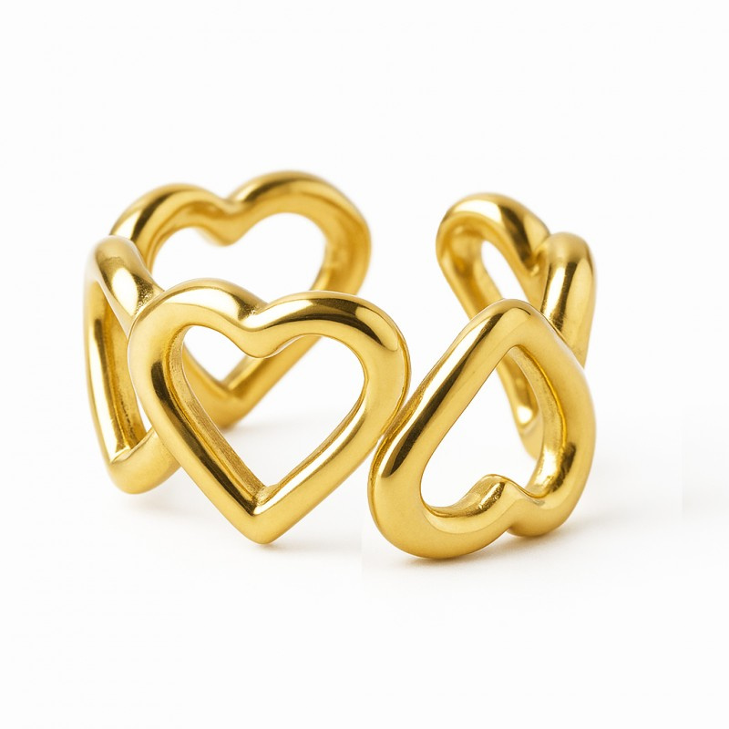 Nowa kolekcja biżuterii ze stali szlachetnej Pierścionek platerowany 14-karatowym złotem Rozmiar: uniwersalny, regulowany Szerokość: 2cm Szerokość od góry: