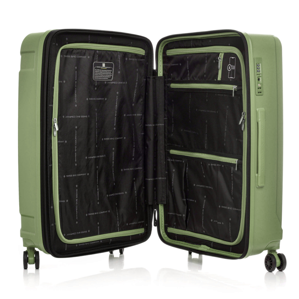 Wnętrze walizki jest podzielone na dwie części. Dolna komora posiada regulowane pasy, uniemożliwiające przesuwanie się bagażu. Całość dopełnia elegancka podszewka.