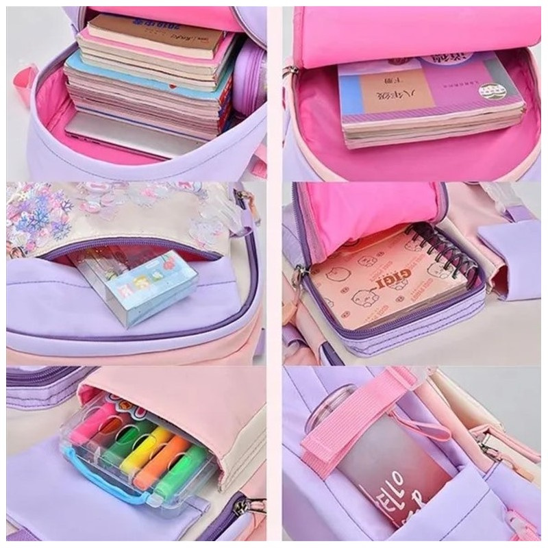 Wodoodporny dziecięcy plecak, szkolny z maskotkąJest bardzo pojemny i praktyczny. Pomieści wszystkie potrzebne rzeczy jak i sprzęt elektroniczny: komputer, piórnik, tablet, telefon etc.Duża pojemność i przestrzeń do przechowywania, plecak dla dziewcząt, może sprostać różnym potrzebom do szkoły, biura, w podróży.Specyfikacja:- Dwie główne komory pomieszczą książki o standardowych rozmiarach;- Trzy przednie kieszenie są idealne na przybory szkolne, przekąski lub inne małe przedmioty;- Dwie boczne kieszenie mogą dobrze sprawdzić się w trzymaniu butelek z wodą i składanych parasoli;- Tkanina nylonowa, trwała, wodoodporna, odporna na zużycie i rozdarcie, lekka, łatwa do czyszczenia;- Oddychający tylny panel, poszerzone i pogrubione regulowane paski zapewniają wygodę i suchość pleców;- Odblaskowe elementy plecaka zapewniają bezpieczeństwo;- Dwukierunkowe, gładkie zamki błyskawiczne;- Duża pojemność: 35 litrów Wymiary: 45 x 32 x 17 cmMateriał:100 % oxfordPodszewka - 100% poliesterWaga:770g