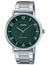 Zegarek męski CASIO MTP-VT03D-3B to połączenie klasycznej elegancji i nowoczesnej funkcjonalności, które sprawia, że każdy mężczyzna poczuje się wyjątkowo. Ten model to prawdziwy hołd dla minimalistycznego designu – jego okrągła, zielona tarcza z subtelnymi srebrnymi wskazówkami i indeksami emanuje spokojem i wyrafinowaniem. Delikatna srebrna koperta dodaje mu odrobiny luksusu, czyniąc go idealnym dodatkiem zarówno do garnituru, jak i casualowych stylizacji. To zegarek, który nie tylko pokazuje czas, ale także opowiada historię Twojego dobrego gustu.