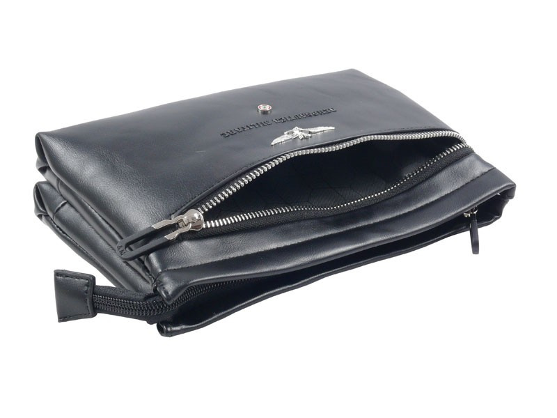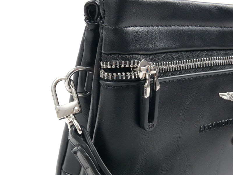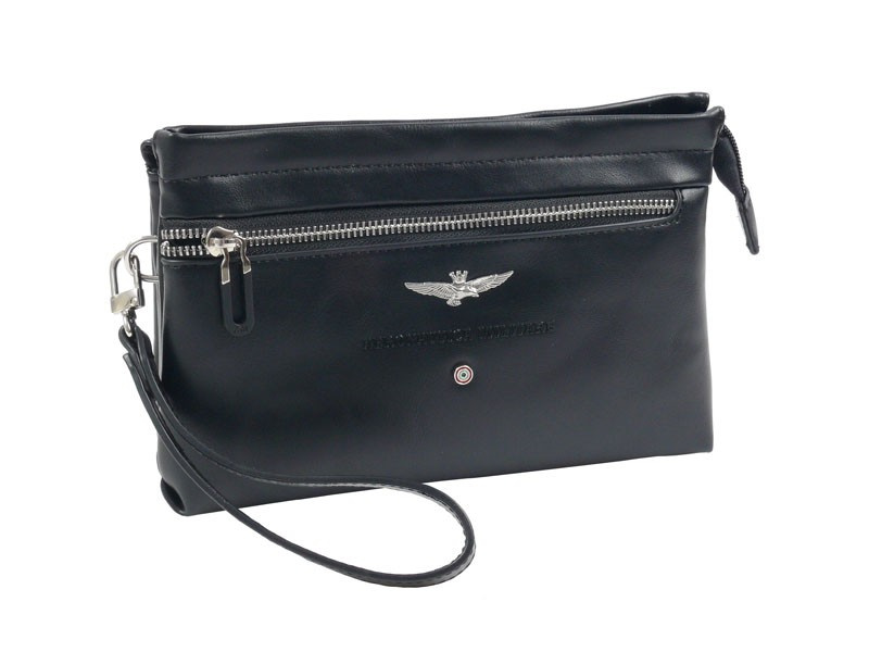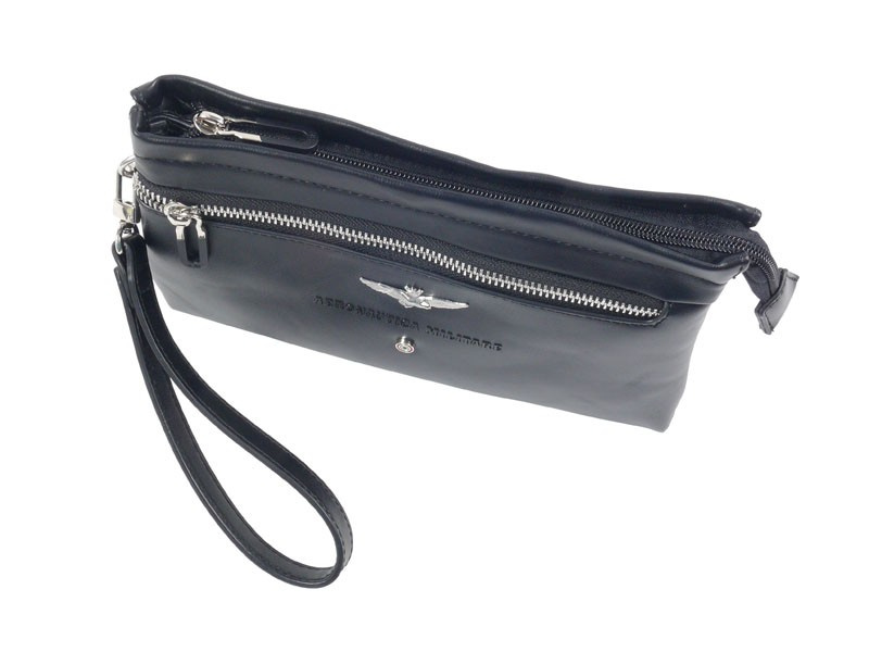 Saszetka męska - kosmetyczka Aeronautica Militare z kolekcji Performance. Kompaktowa saszetka z paskiem na nadgarstek to idealny wybór na codzienne wyjścia i podróże.Sprawdzi się zarówno w codziennych, jak i bardziej formalnych zestawieniach. Wykonana z wysokiej jakości skóry ekologicznej, odpornej na przetarcia i zachlapania. Posiada wewnętrzny organizer i kieszeń zapinaną na suwak, co pozwala zachować porządek i łatwy dostęp do najważniejszych rzeczy. Saszetka posiada dwie praktyczne komory – oddzielne przegrody pozwalają łatwo posegregować wszystkie niezbędne drobiazi. Metalowe zamki błyskawiczne gwarantują bezpieczeństwo przechowywanych przedmiotów. Odpinany pasek na nadgarstek służy do noszenia w ręce lub zawieszenia na przegubie dłoni zapewniając maksymalny komfort i pełną swobodę ruchu. Dodatkową opcją przenoszenia saszetki jest tylny uchwyt do trzymania w dłoni. Metalowe detale z charakterystycznym logo oraz wytłoczony napis Aeronautica Militare stanowią stylowy akcent przyciągający uwagę. Zaprojektowana w praktyczny i funkcjonalny sposób cechuję się niewielką wagą i starannym wykończeniem.