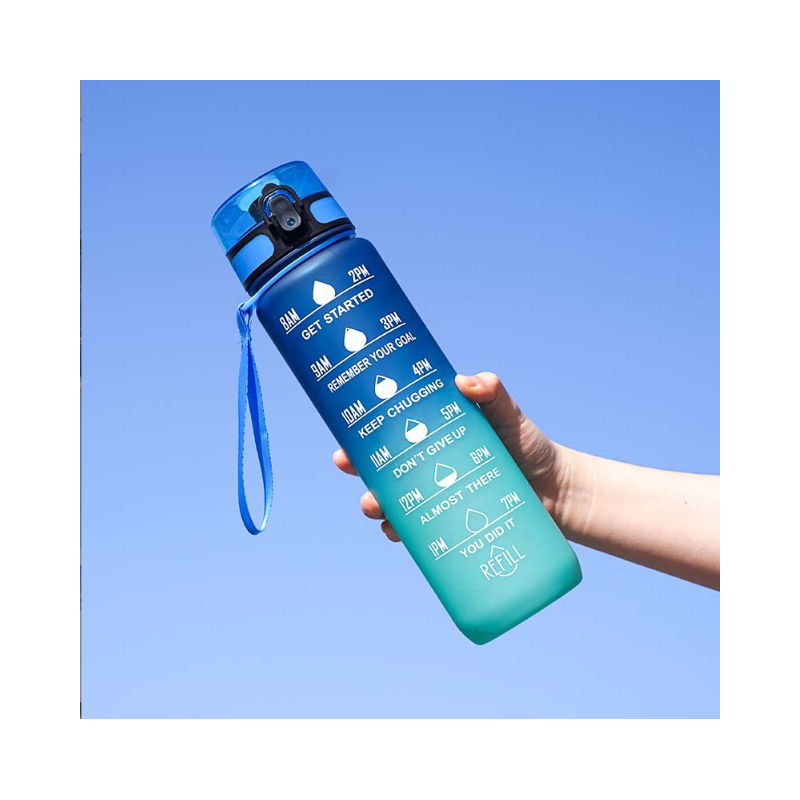 Specyfikacja: - Pojemność: 1000ml (średnica 7,5 cm, wysokość z zawleczką 28 cm), - Materiał: PC + PP + silikon - Bidon ze smyczą. - Duży i wygodny otwór do