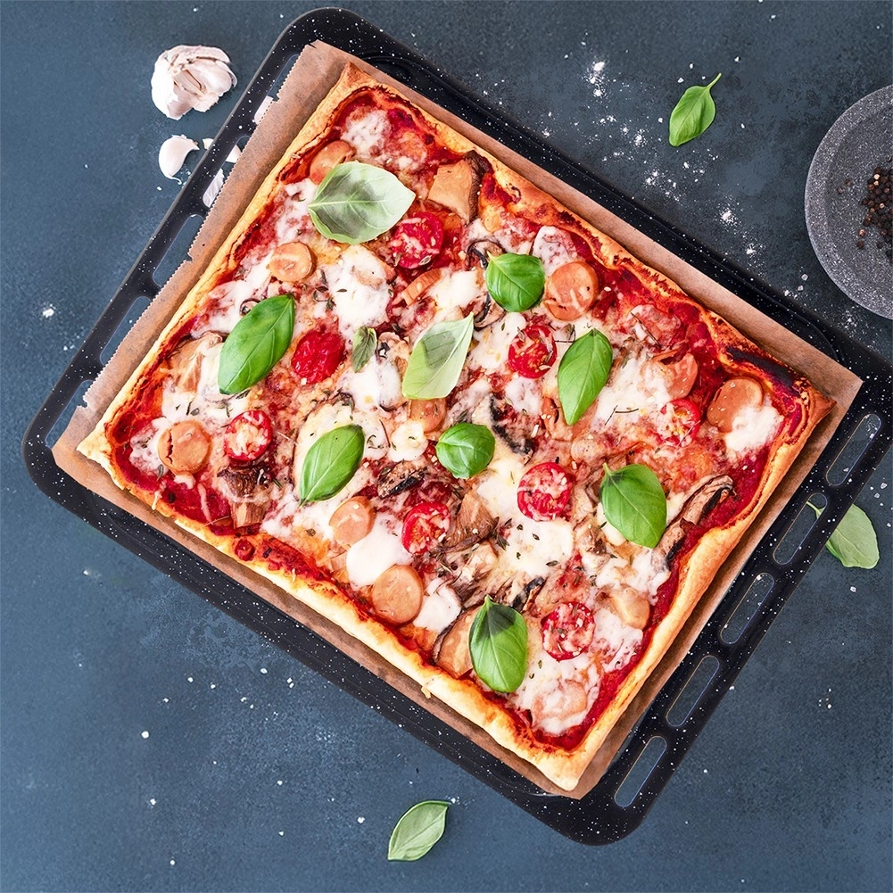 • Blacha emaliowana z nieprzywierającą powłoką do pieczenia ciast, mięsa, pizzy czy warzyw. Blacha nadaje się do piekarników gazowych oraz elektrycznych.