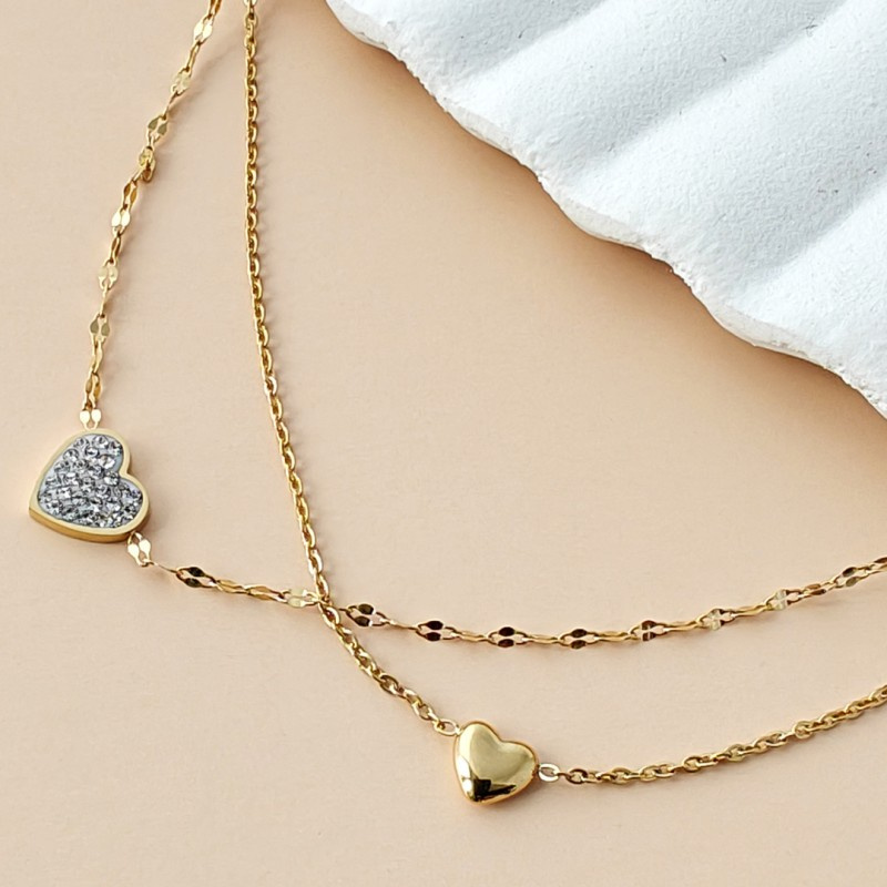 Bransoletka podwójna na rękę stal chirurgiczna pozłacana 14k złotem, serca, cyrkonie - BST1549