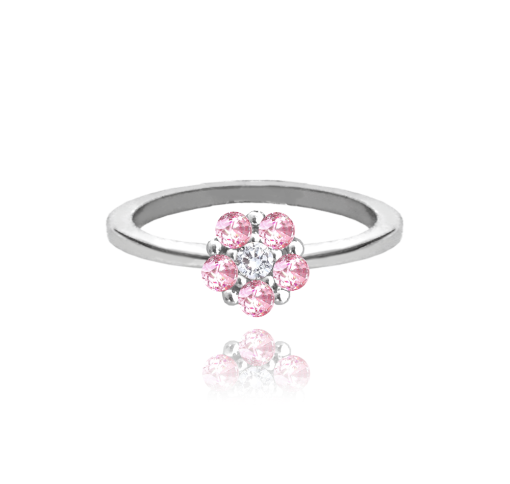 Ten popularny srebrny pierścionek z różowym kamieniem i białą cyrkonią sześcienną jest jednym z najlepiej sprzedających się pierścionków MINET.
