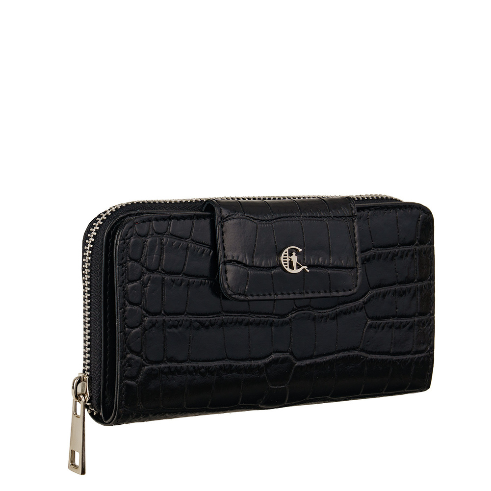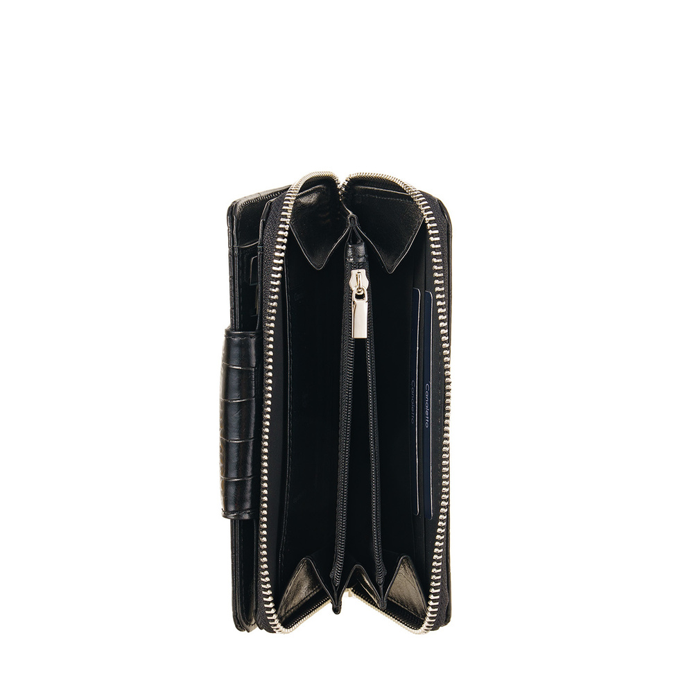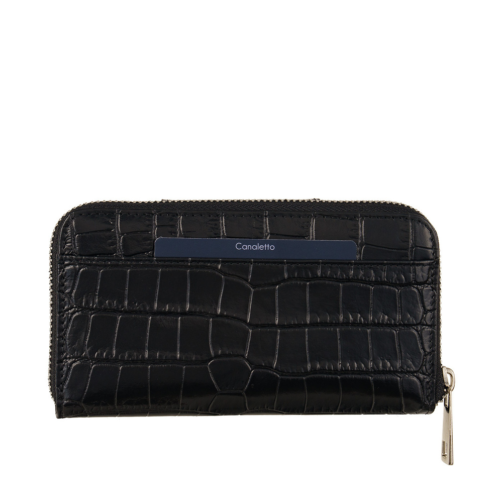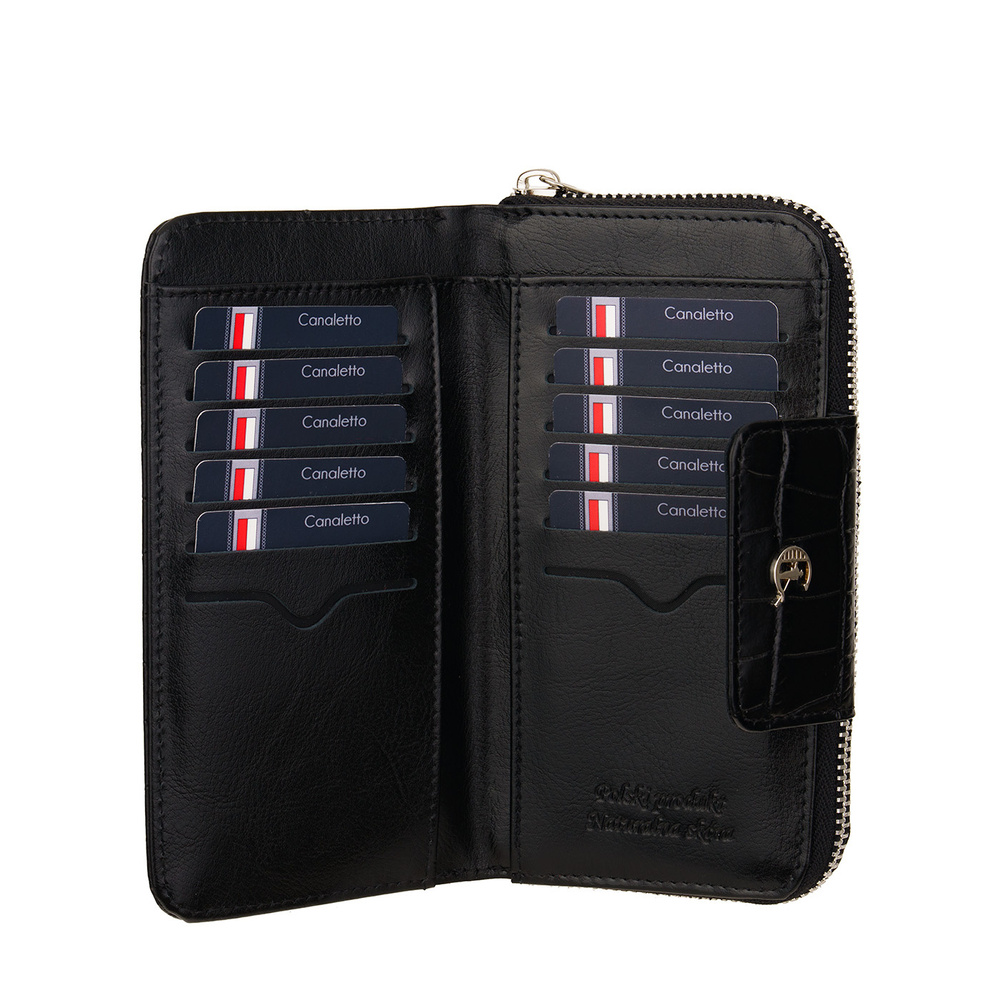 Portfel damski marki Canaletto, wykonany z najwyższej jakości włoskiej skóry licowej garbowanej roślinnie o wzorze krokodyla w głębokim czarnym odcieniu, to idealny wybór dla kobiet, które poszukują luksusowego wyglądu i przestronności.