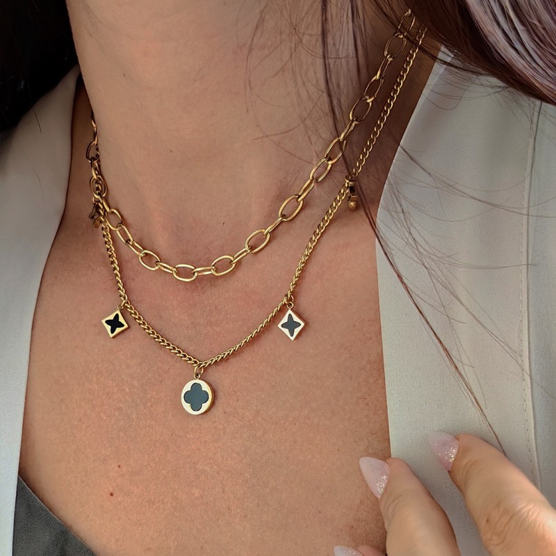 Kolor: Jasny odcień złota, czarny Wymiary:  - długość krótszego naszyjnika 39 cm + 5 cm regulacji Biżuteria ze stali chirurgicznej nie ulega korozji, nie
