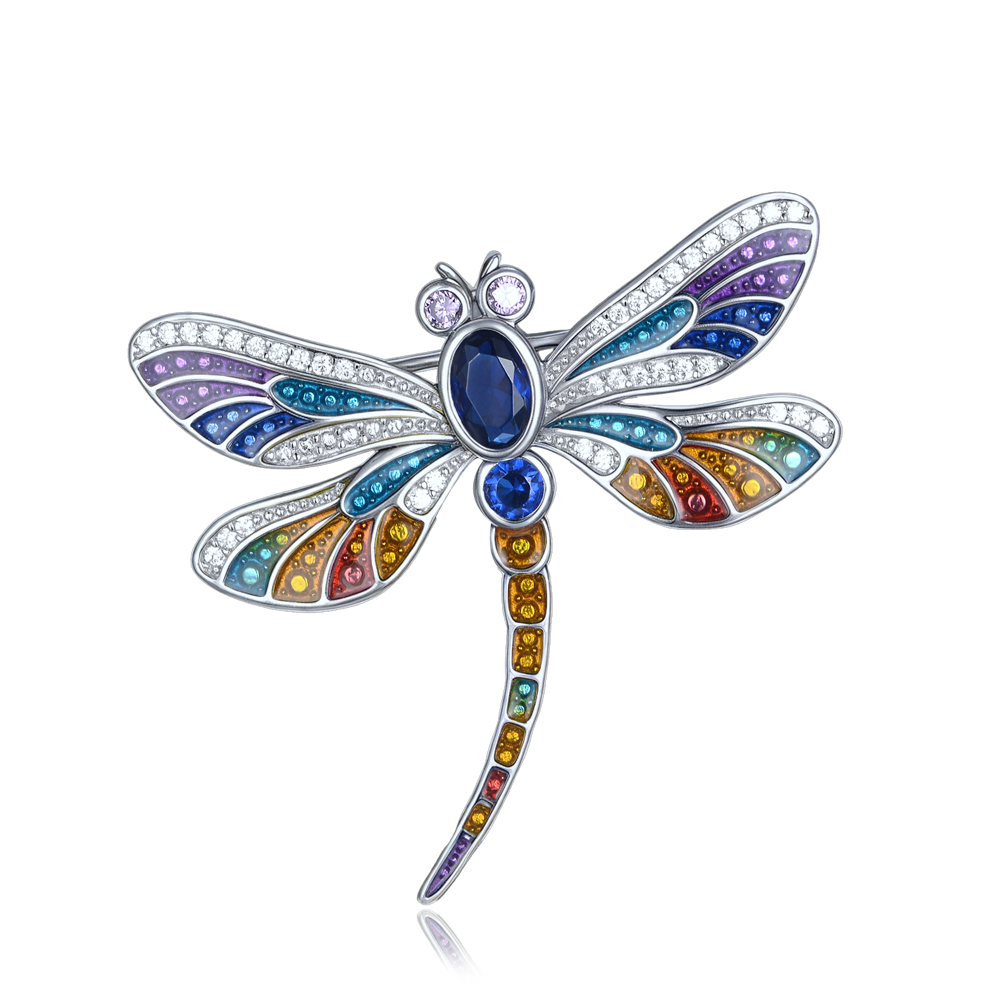 MINET Srebrna broszka ważka z wielobarwnymi cyrkoniami