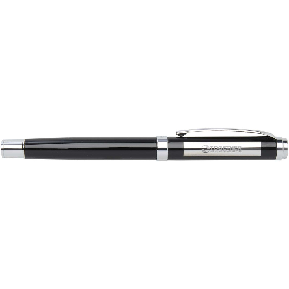 Długopis ma metalowe detale w kolorze srebrnego chromu oraz logo LUXE na środkowym pierścieniu.