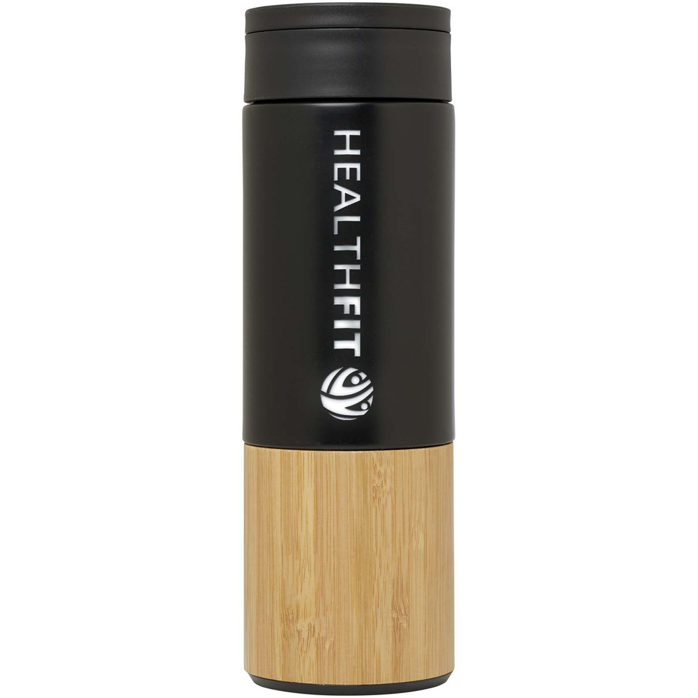 Butelka na wodę o pojemności 450 ml wykonana ze stali nierdzewnej z bambusowym dodatkiem w dolnej części.