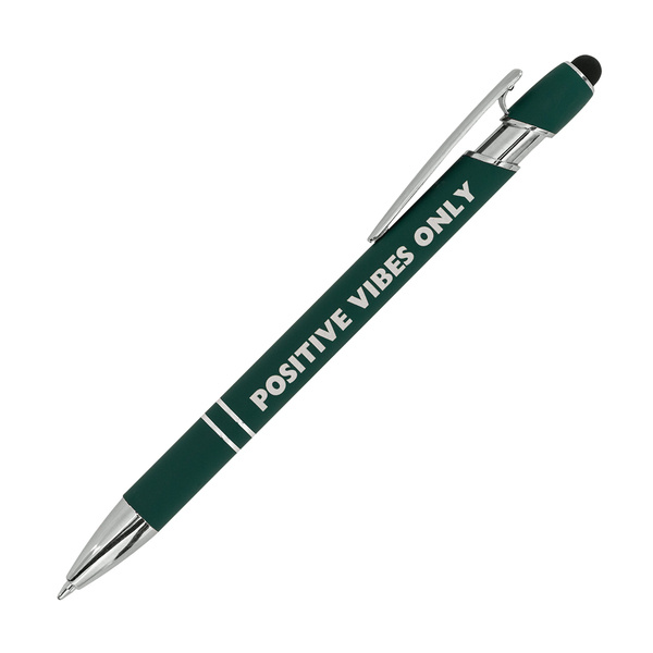 Aluminiowy długopis o przyjemnym w dotyku, satynowym wykończeniu ze srebrnymi elementami. Wyposażony w końcówkę do ekranów dotykowych. Niebieski wkład.