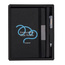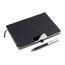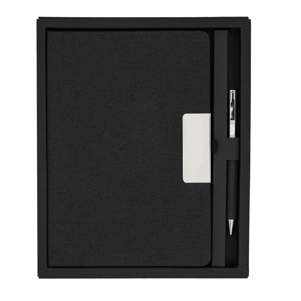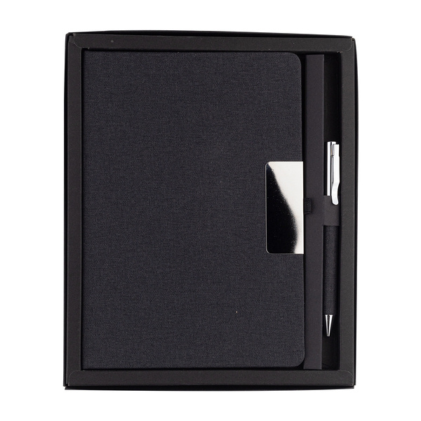Zestaw upominkowy w pudełku. Notatnik A5 w twardej okładce RPET, z metalowym elementem; 80 kartek w kratkę, o gramaturze 70 g/m². Metalowy długopis w tkaninie RPET i srebrnymi detalami. Niebieski wkład 1 mm.