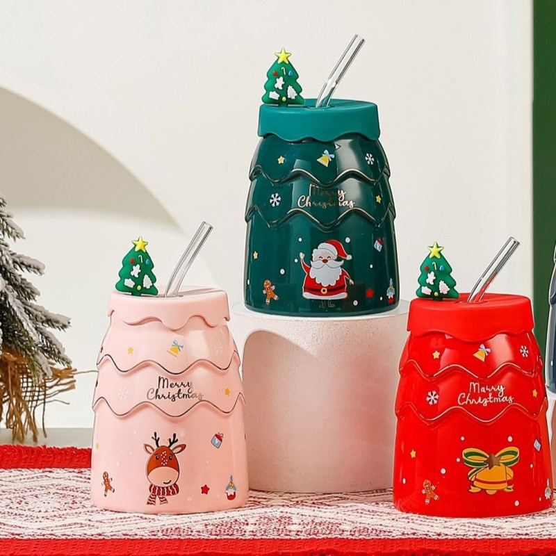 KUBEK CERAMICZNY z motywem świątecznym Zestaw z silikonową pokrywką i rurką Idealny gadżet dla każdego miłośnika kawy czy herbaty.