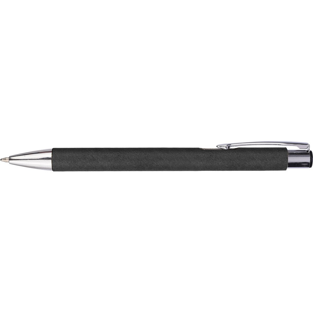 Długopis, klip ułatwiający zawieszanie na kieszeni albo okładce notatnika, wkład w czarnym kolorze, trzon wykonany z papieru z recyklingu, klips z metalu, końcówka z plastiku