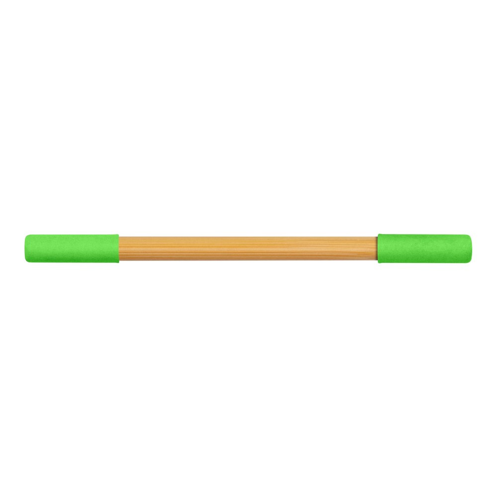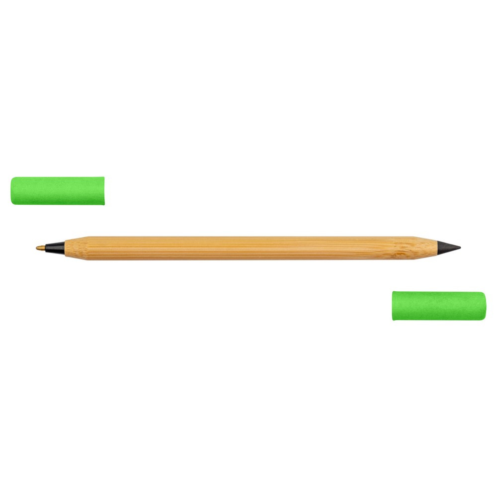 Długopis 2 w 1, "wieczny" ołówek, dzięki wykorzystaniu specjalnej wolnościerającej się końcówki długość pisania ołówka to około 1500 metrów, naostrzony, bambusowy trzon, dwie kolorowe zatyczki wykonane z papieru