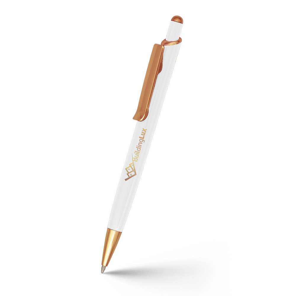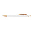 Długopis z kolorowym trzonem i błyszczącymi elementami kolorze różowego złota, wkład w niebieskim kolorze, grawer ukazuje powierzchnię w kolorze złotym, produkt wykonany z aluminium