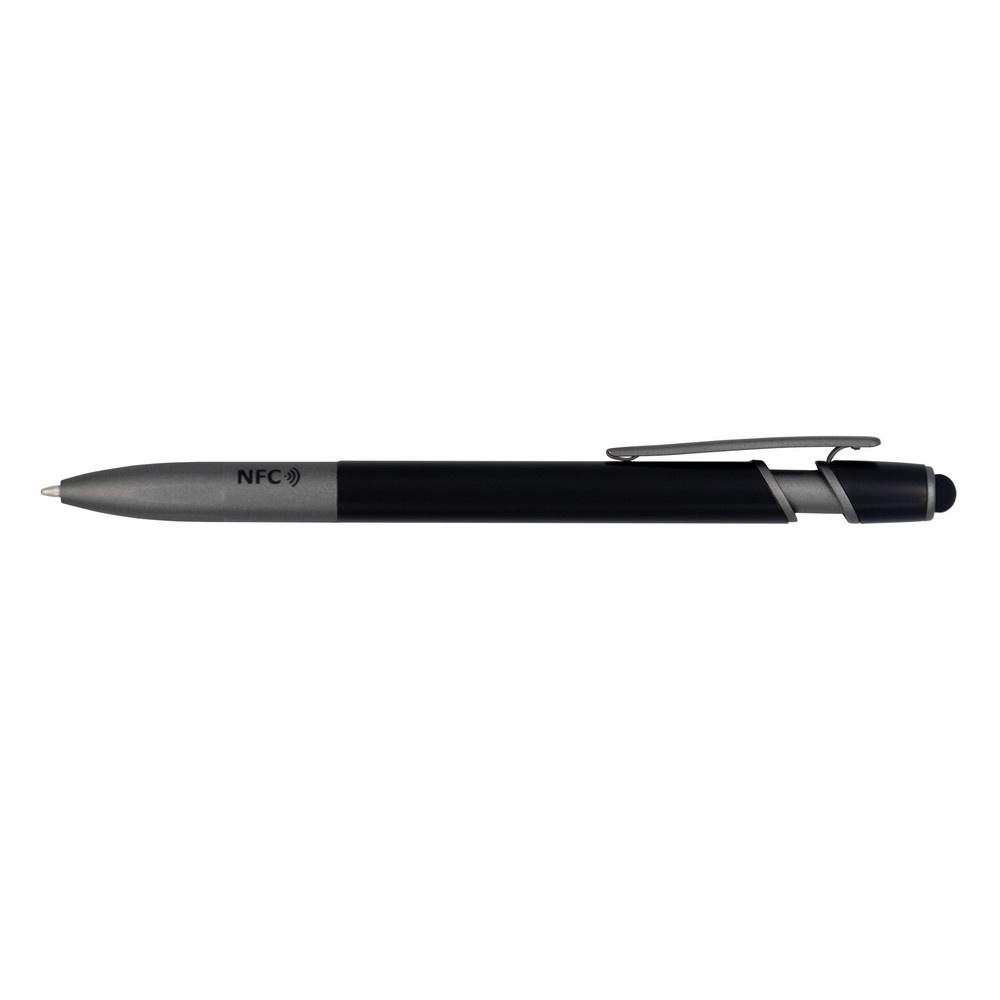 Długopis z chipem NFC (Near Field Communication), działa z urządzeniami posiadającymi technologię NFC, posiada matowy trzon o gumowym wykończeniu i elementy w grafitowym kolorze, końcówka touch pen umożliwia obsługę ekranów dotykowych, wkład w niebieskim kolorze, grawer ukazuje lśniącą powierzchnię. NFC to międzynarodowy standard komunikacji bezprzewodowej wymiany danych na niewielkie odległości. Umieszczony w długopisie chip umożliwia zapisanie na nim np. adresu strony internetowej, który zostanie odczytany przez urządzenie z technologią NFC po zbliżeniu go do logotypu NFC znajdującego się na produkcie. Produkt wykonany z aluminium z recyklingu oraz plastiku.