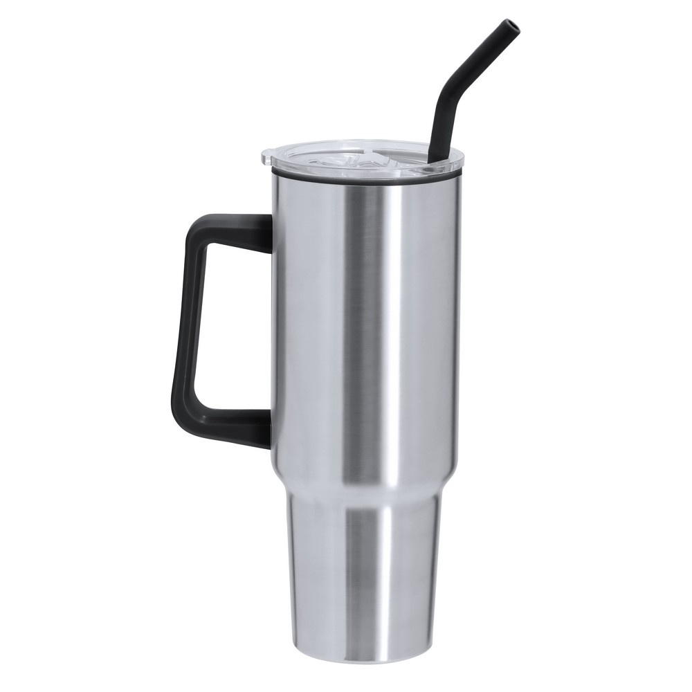 Kubek termiczny 1200 ml z pokrywką, rączką i słomką, czarne wnętrze z PP, posiada podwójne ścianki, które spowalniają oddawanie temperatury na zewnątrz, produkt wykonany ze stali nierdzewnej