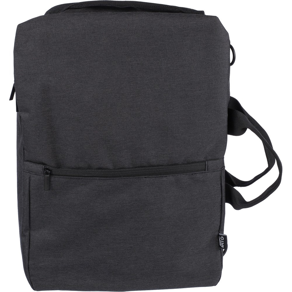 Plecak na laptopa 15" z podszewką wewnątrz, pojemność plecaka to 1 l, posiada uchwyt do noszenia w dłoni oraz dwa boczne uchwyty, dwie duże przegrody zapinane na zamek, w tym jedna z przegrodą na laptopa 15" zapinaną na rzep, z przodu mała kieszonka zapinana na zamek, wewnątrz oddzielny regulowany pasek na ramię do zamocowania na plastikowych haczykach (łącznie 4 plastikowe haczyki), za wyściełanym tyłem ukryte są dwa regulowane paski na ramiona, które umożliwiają noszenie torby jak plecaka, sprawdzi się w podróży, ikona RPET na metce, produkty wykonany z RPET, poliestru, siatki i pianki