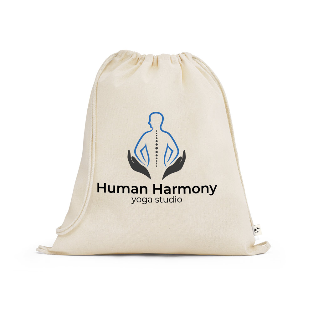Plecak wykonany w 100% z bawełny organicznej (140 g/m²), z bawełnianymi uchwytami do zamykania. 370 x 410 mm