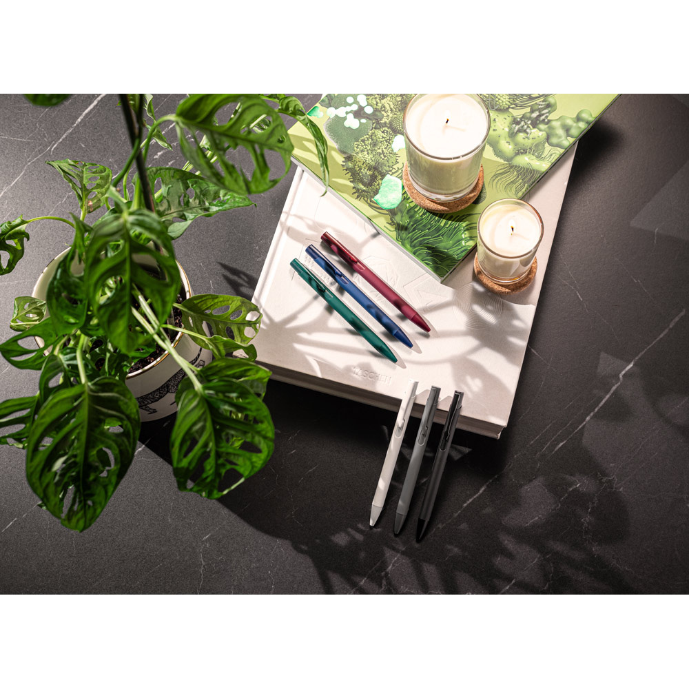 Pióro kulkowe z recyklingowanego aluminium (100% rAL) z gumowym wykończeniem. Niebieski tusz. ø10 x 136 mm