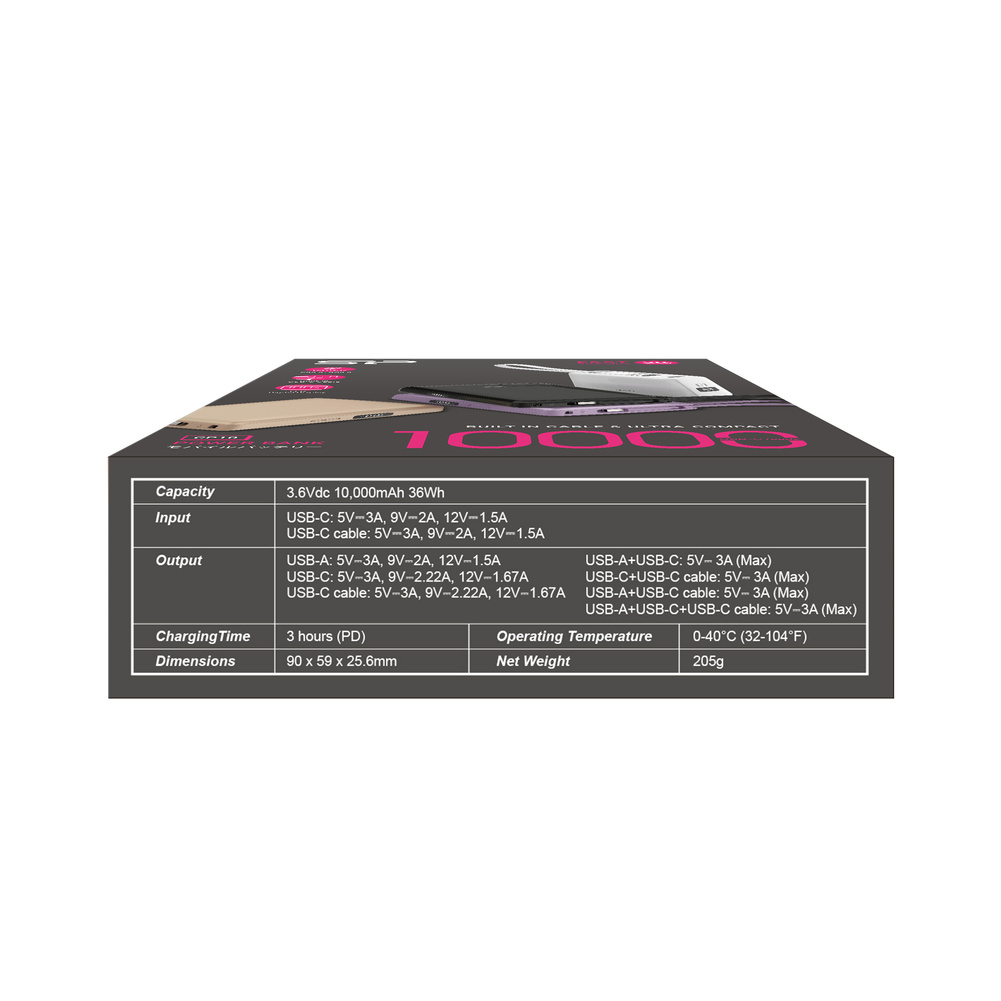 Power bank Silicon Power CP10 to kompaktowe i eleganckie urządzenie o pojemności 10 000 mAh z wbudowanym przewodem USB‑C, dzięki któremu nie musisz nosić dodatkowych kabli. Obsługuje szybkie ładowanie PD 20 W i QC 18 W, pozwalając naładować smartfon do 50% w zaledwie 30 minut. Wyposażony jest w cyfrowy wyświetlacz pokazujący poziom baterii oraz trzy wyjścia (USB‑C, USB‑A i kabel), co umożliwia ładowanie trzech urządzeń jednocześnie. Solidna obudowa z ognioodpornego tworzywa i system zabezpieczeń smartSHIELD zapewniają bezpieczeństwo użytkowania. Niewielkie wymiary i waga sprawiają, że zmieści się w kieszeni lub torebce.
