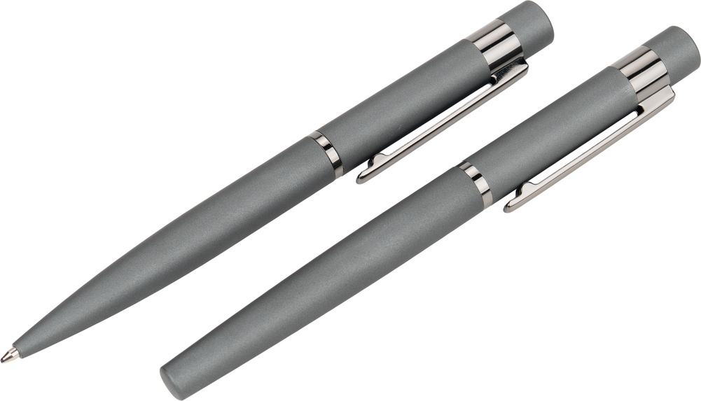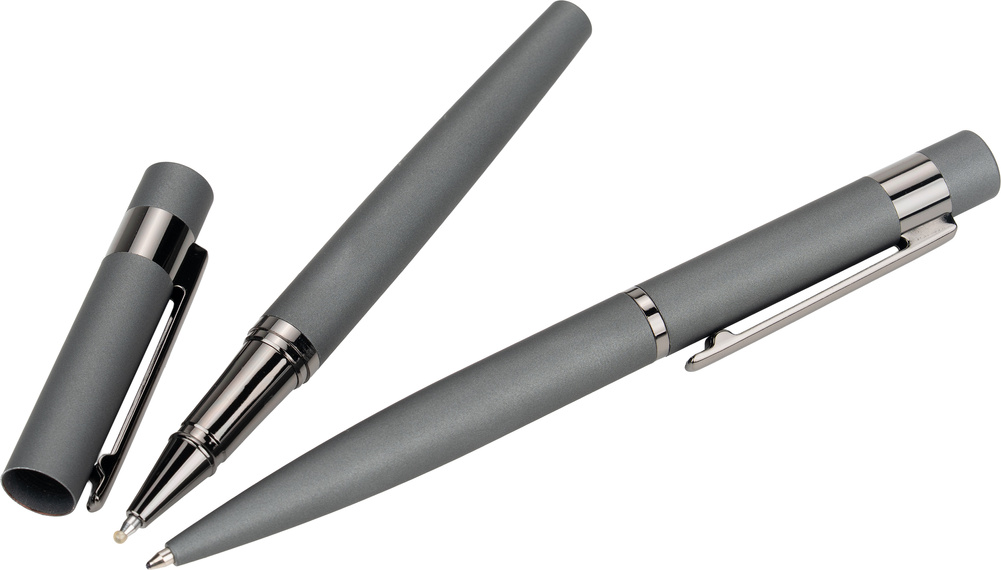 Zestaw piśmienny marki MoLu, składający się z długopisu i pióra kulkowego z gumowaną powierzchnią soft touch.