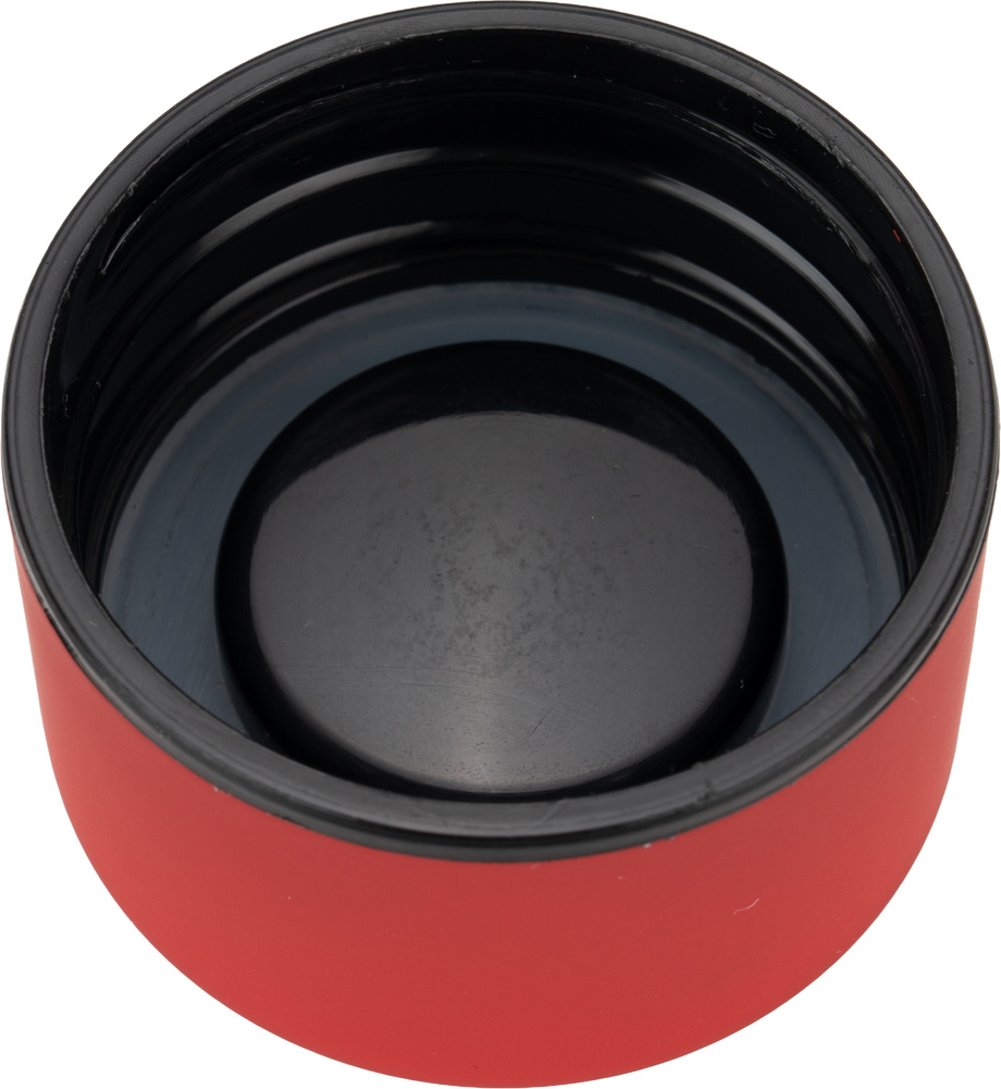 Stalowa butelka z gumowaną powierzchnią oraz pętelką do przenoszenia.