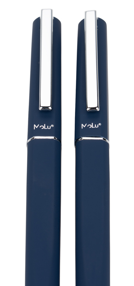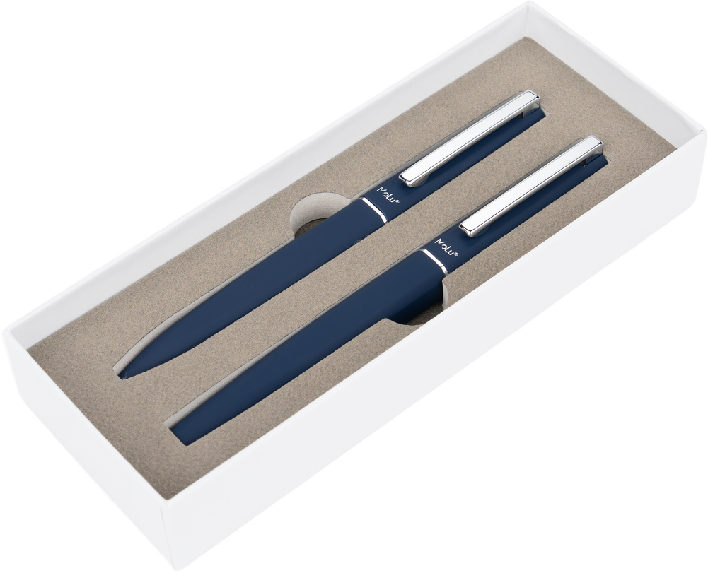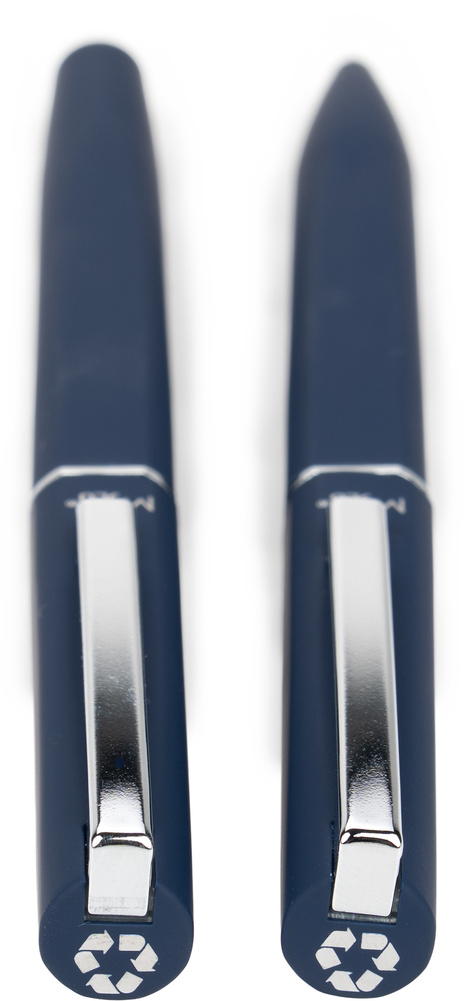 Zestaw piśmienniczy, składający się z długopisu i pióra kulkowego, wykonanych ze stali nierdzewnej, pochodzącej z recyklingu. Oba instrumenty piśmiennicze posiadają gumową powłokę i akcenty w kolorze gun-metal.