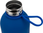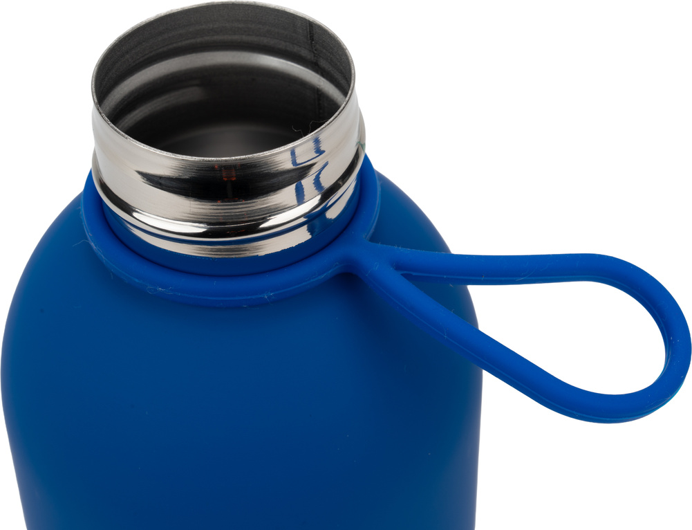 Stalowa butelka z gumowaną powierzchnią oraz pętelką do przenoszenia.