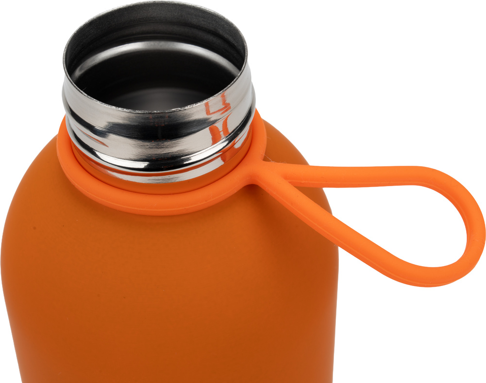 Stalowa butelka z gumowaną powierzchnią oraz pętelką do przenoszenia.