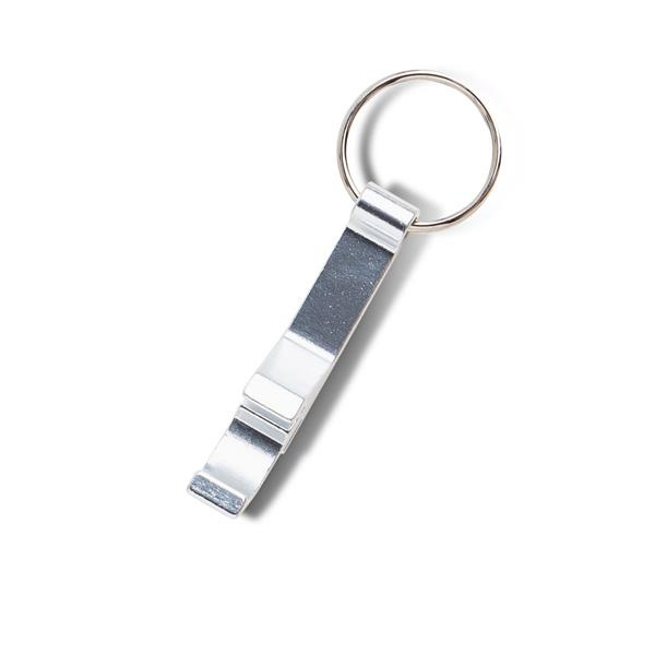 Aluminiowy breloczek w kształcie otwieracza do butelek.