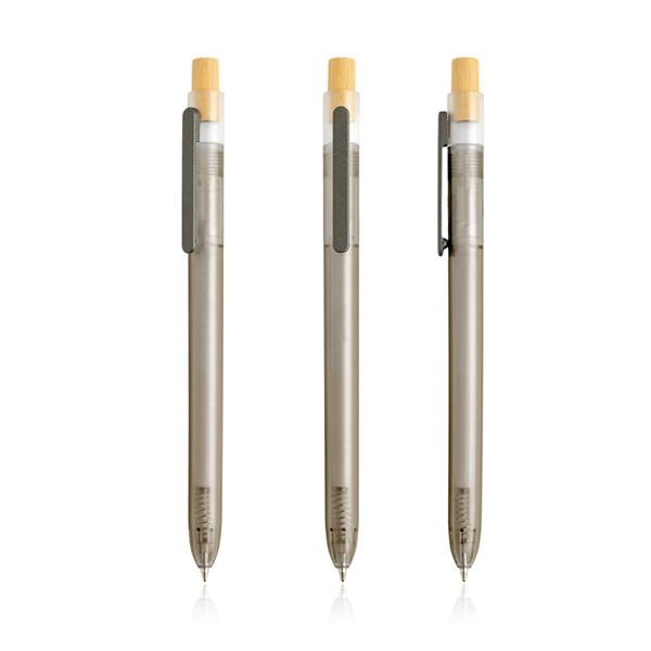 Długopis z bambusowym detalem. Długopis wykonany z przetworzonego plastiku z oceanów, z przezroczystym korpusem i bambusowym przyciskiem, pisze na niebiesko. Zobacz także wersję z przezroczystym korpusem 131597