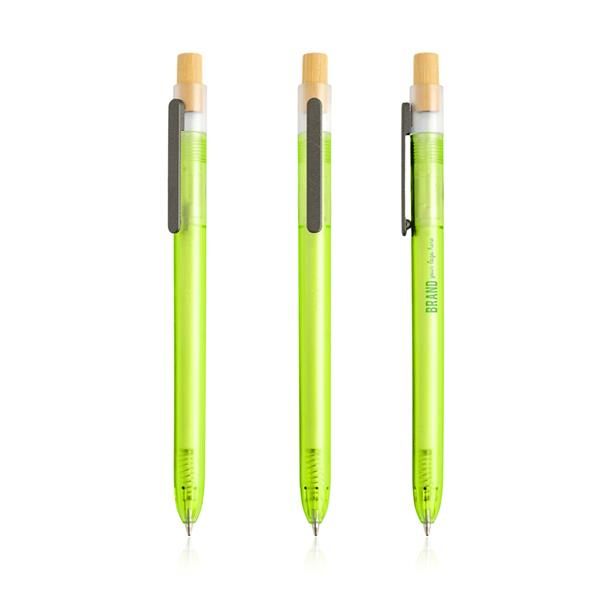 Długopis z bambusowym detalem. Długopis wykonany z przetworzonego plastiku z oceanów, z przezroczystym korpusem i bambusowym przyciskiem, pisze na niebiesko. Zobacz także wersję z przezroczystym korpusem 131597