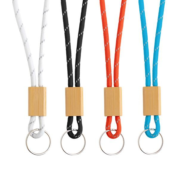 Brelok sznurkowy, regulowany z kółkiem i bambusowym detalem wykonany z poliestru. Dodaj swoje logo, slogan lub unikalny projekt, aby stworzyć wyjątkowy produkt odzwierciedlający tożsamość Twojej marki.