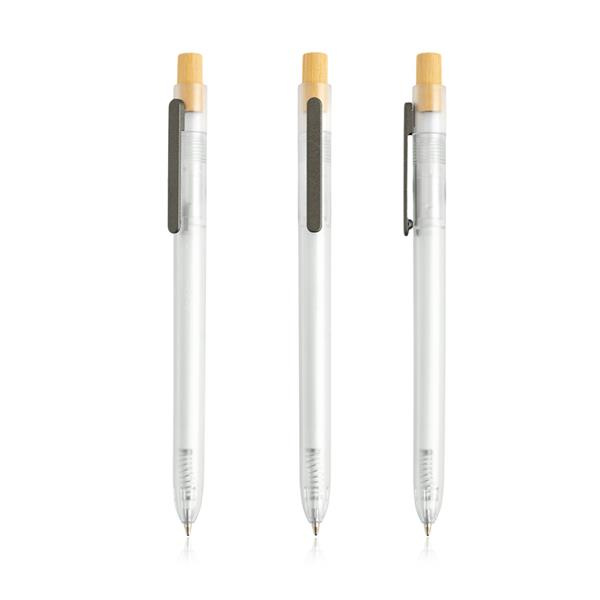 Długopis z bambusowym detalem. Długopis wykonany z przetworzonego plastiku z oceanów, z przezroczystym korpusem i bambusowym przyciskiem, pisze na niebiesko. Zobacz także wersję z przezroczystym korpusem 131597