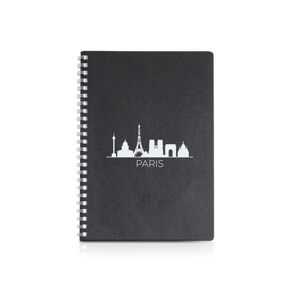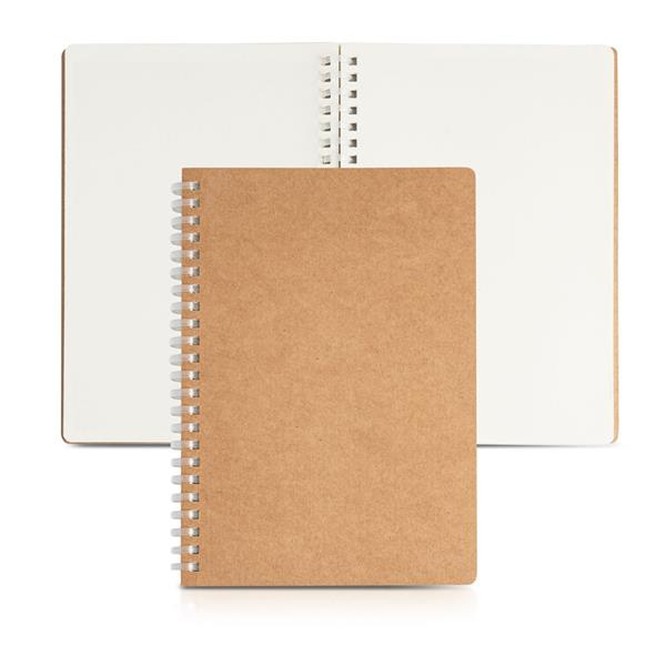 Notes A5 na spirali z miękką okładką kartonową, posiada 136 czystych kremowych stron i certyfikat FSC