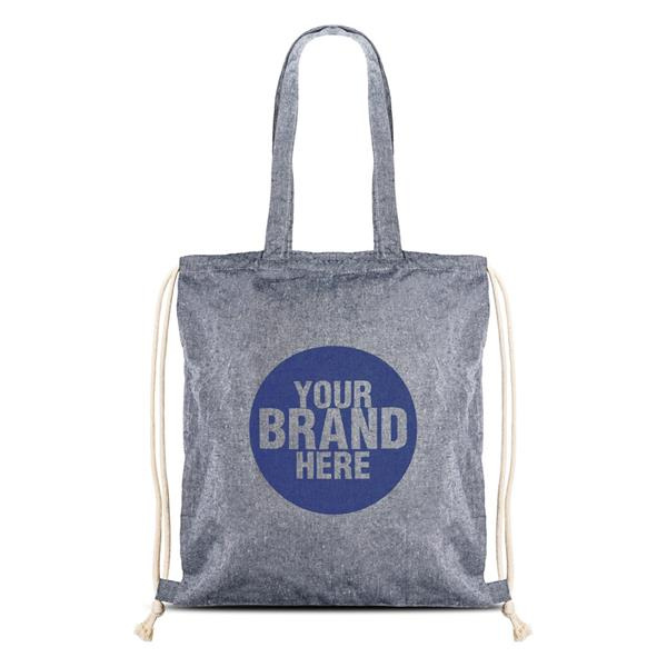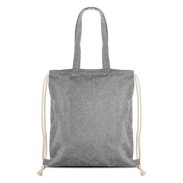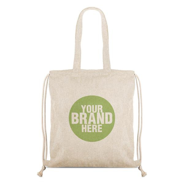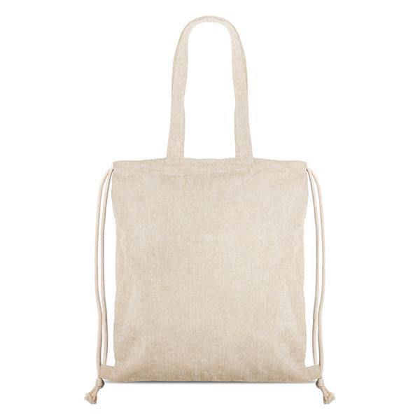 Backpack bag, long handles in recycled cotton 140g/m². A versatile gift that can be used in different ways, as it includes drawstring straps to use as a backpack and long handles to use as a bag. Made from recycled and eco-friendly material.