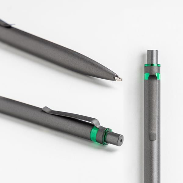 Aluminiowy długopis z kolorowym detalem. Wykonnay jest z materiałów poddanych recyklingowi, więc wybierając ten produkt wspierasz ograniczanie emisji CO2.