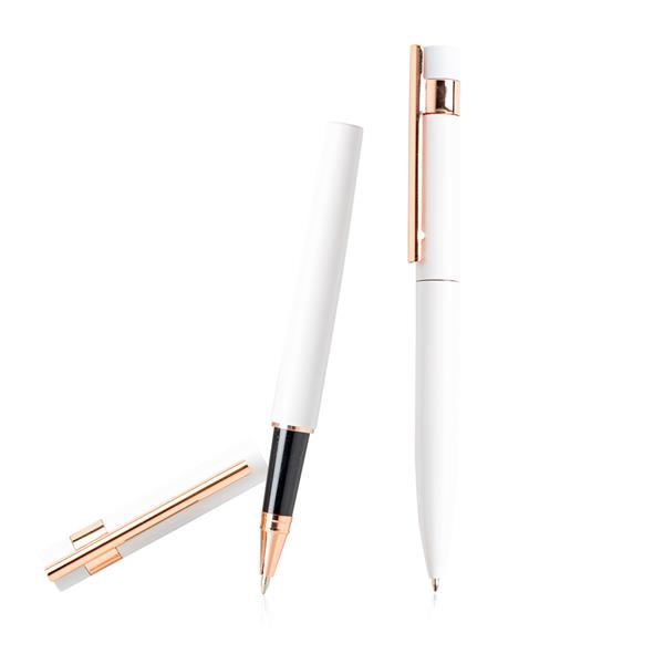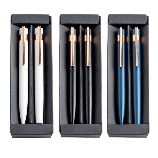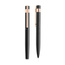 Zestaw piśmienniczy w czarnym kartoniku prezentowym wykończony elementami w kolorze rose gold, idealnie nadaje się do grawerowania.