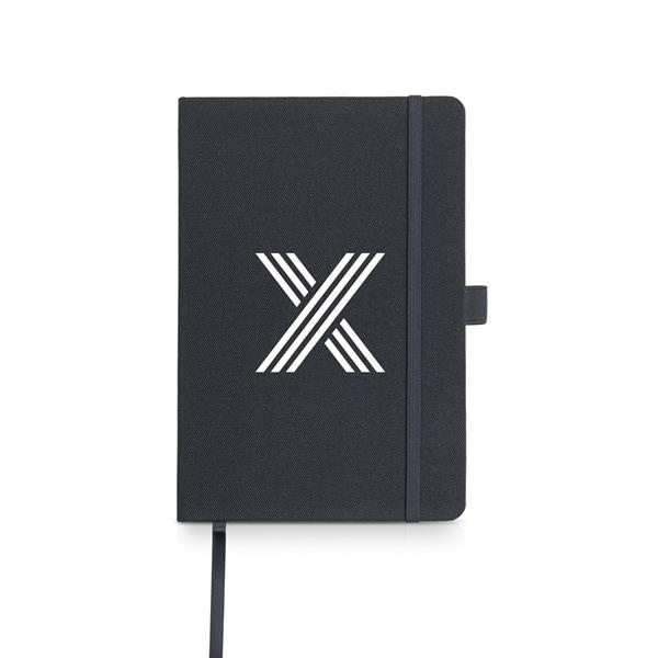 Notes A5 z RPET z gumką na długopis, posiada twardą okładkę 160 białych stron i certyfikat FSC