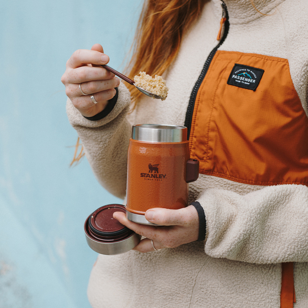 Termos obiadowy w zestawie ze sztućcemIdealne rozwiązanie do zabrania smacznego i pożywnego posiłku do pracy, szkoły lub w podróż. Jego rozmiar pasuje zarówno do męskiej oraz damskiej dłoni. Dwie ścianki i korek z izolacją sprawią, że Twój posiłek pozostanie gorący. Gdy termos jest pełny trzyma temperaturę do 7 godzin. Korek wyposażony jest w silikonową uszczelkę gwarantującą szczelność. Szeroki wlot o średnicy 7cm. Termos wykonany ze stali nierdzewnej. Produkt można myć w zmywarce. Podawane parametry dotyczące utrzymania temperatury dotyczą pełnego naczynia, nieotwieranego przez określony czas. Otwieranie naczynia i częściowe opróżnianie wiąże się z szybszą utratą początkowej temperatury. Dla wydłużenia czasu utrzymania temperatury zaleca się, aby najpierw wypełnić naczynie gorącą wodą i pozostawić na 5 minut szczelnie zamknięte, po czym opróżnić i napełnić docelowym napojem lub potrawą oraz szczelnie zamknąć.Mycie w zmywarce produktów, które są do tego przeznaczone może z czasem powodować szybsze pogarszanie się ich właściwości wizualnych w porównaniu do mycia ręcznego. Jeśli jest dla Ciebie ważne, aby Twój produkt dłużej zachował swój wygląd, producent zaleca mycie ręczne za pomocą delikatnej gąbki.