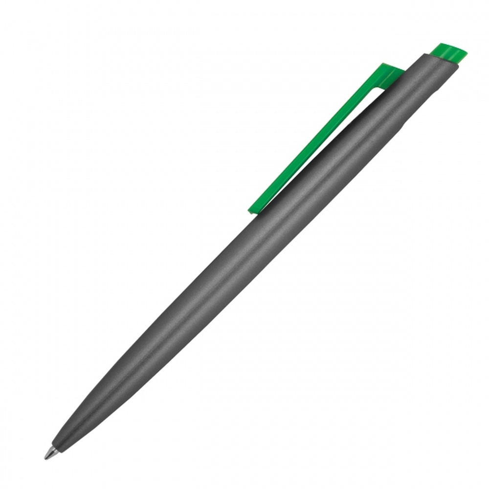 Długopis wykonany z plastiku z recyklingu, z kolorowymi akcenatami i wkładem piszącym na niebiesko.